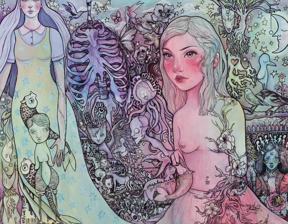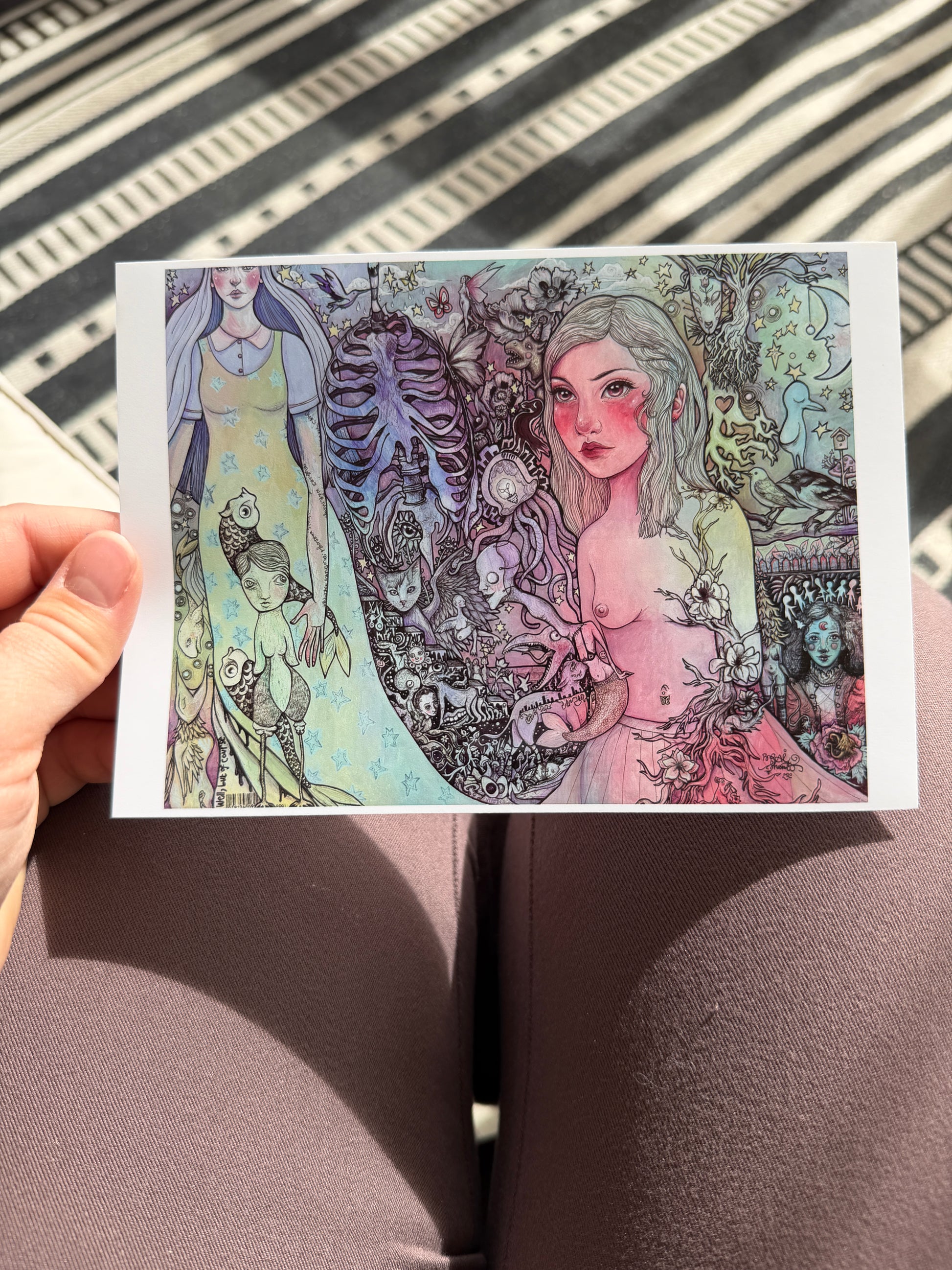 The original is a mixed media painting with strange characters in a surreal, whimsical setting. Pastel rainbow background.