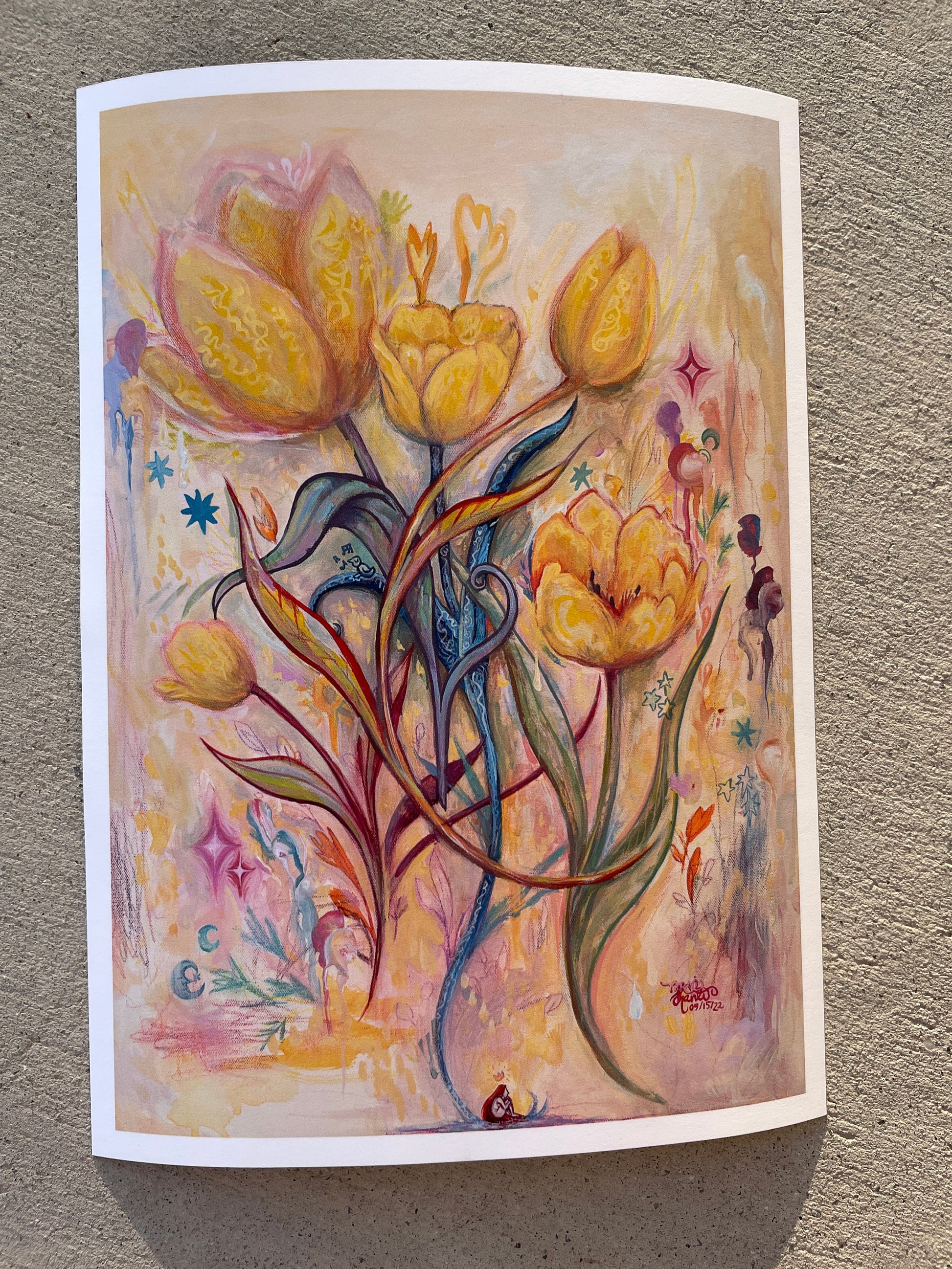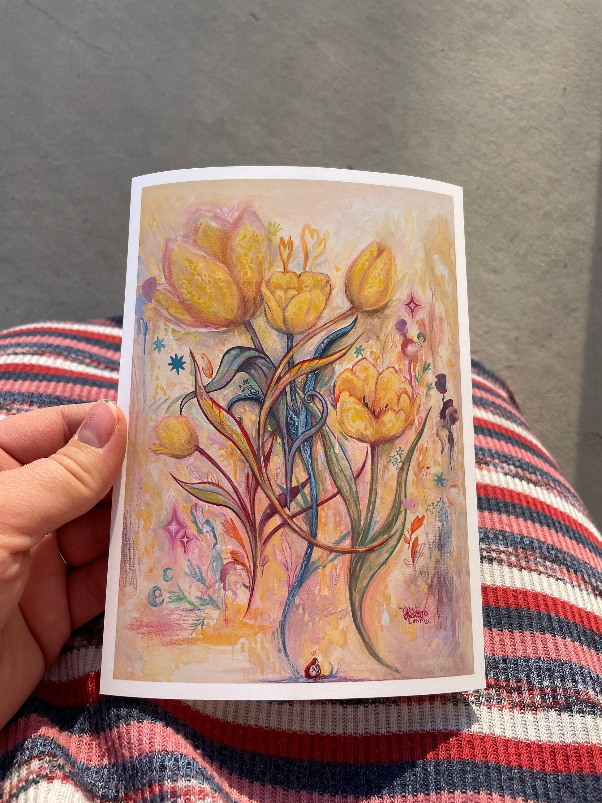 The original is an acrylic painting depicting colorful yellow tulips with whimsical elements such as stars, moons, and rainbow drips. The bottom is hiding a red haired woman deep in thought.