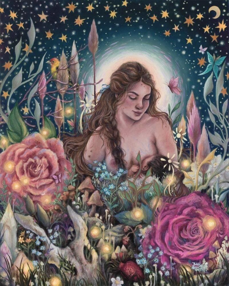 The original is an oil painting depicting the archetypal mother and creator~ Gaia, Mother of the Earth, Madonna, Venus. She is a glowing goddess giving life and vitality to her young, while surrounded by the balance of life. Vibrant, vivid, the vision of nurture surrounded by nature. Inspired by my own breastfeeding journey with both of my children.