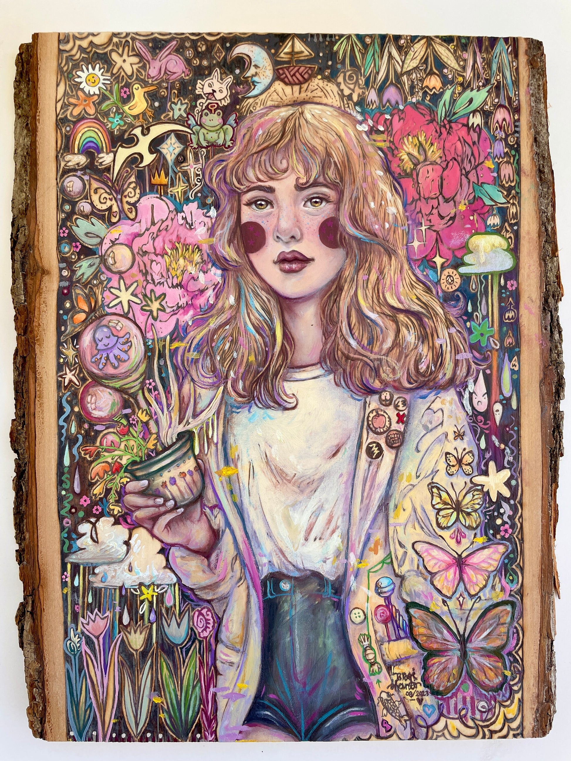 The original is a woodburning with oil paint depicting a whimsical story of garden wonder.